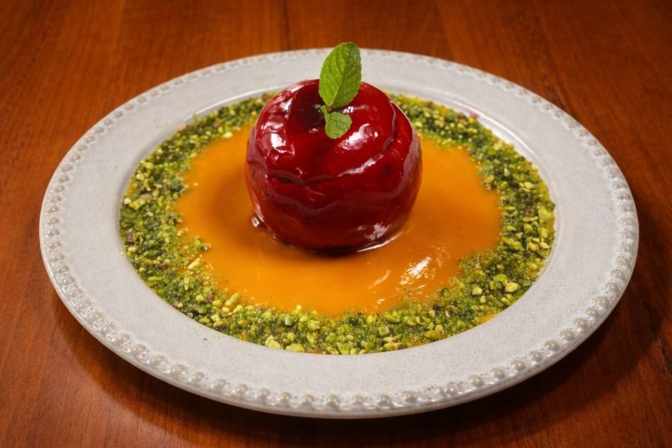 (печёное наливное яблоко по новому рецепту, с ароматом запечённых сладких сухофруктов в сладко-кислом соусе из манго и лимона)