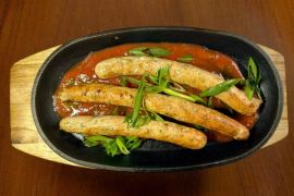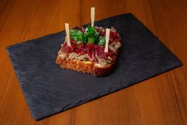 (паштет из куриной печени с эспрессо и сливками, луковый мармелад, брусничный соус, хлеб бриошь)